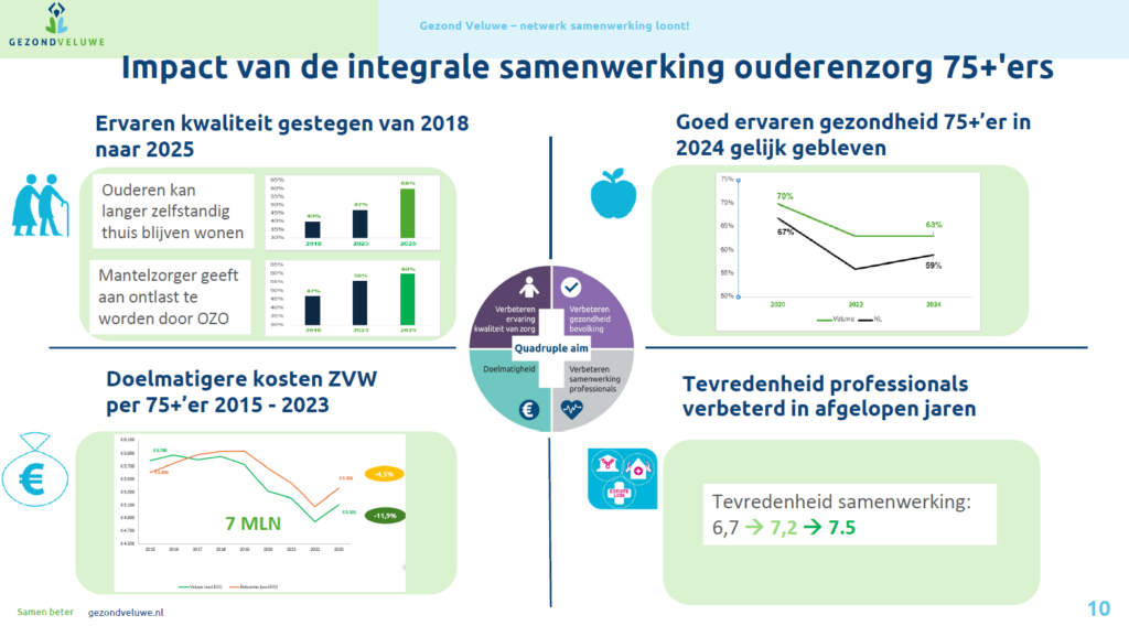 Door de langdurige focus op deze groep kwetsbare ouderen zijn er de afgelopen jaren veel initiatieven opgepakt. Hierdoor zie je, in het beeld hieronder, positieve én meetbare impact op de Quadruple Aim.